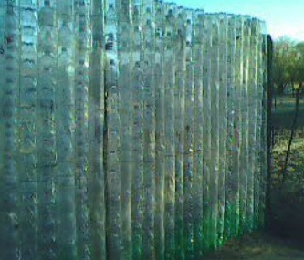 Para la sujección de las columnas, se colocan entre poste y poste dos tiras de alambre bien tenso que servirán de guía. Luego, se sujetan tres tiras largas y dobles de alambre a diferentes alturas del primer poste. Una tira a 5 o 10 cm del nivel del suelo, la segunda en el medio del poste y la tercera 5 o 10 cm antes de llegar al final del poste. Estas tiras servirán para tejer las columnas de botellas.